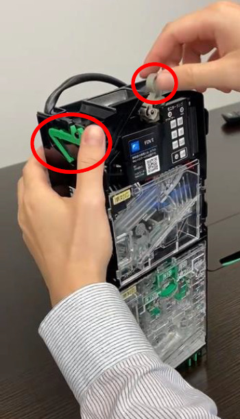 ①コインメック(下の写真)の左側面の緑色のアクセプターラッチと返却スイッチのつまみを持ちます。