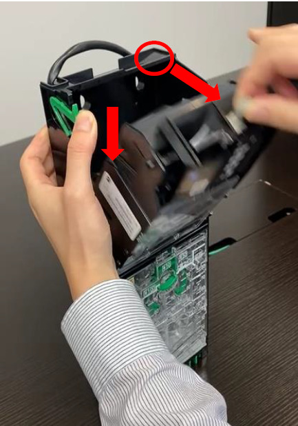 ②緑色のアクセプターラッチを下げながら返却スイッチのつまみを