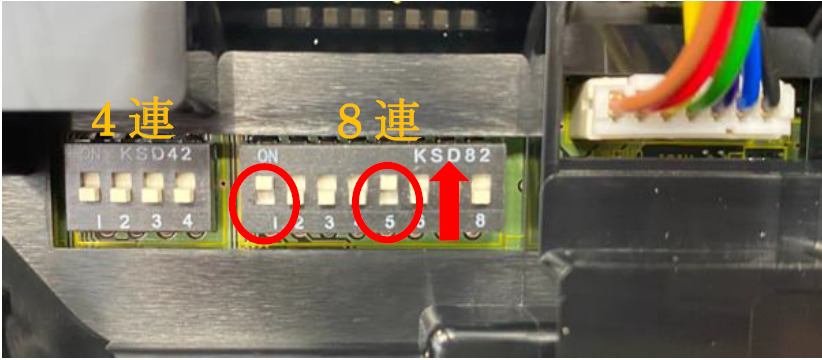 ④ディップスイッチ8連側の<1>と<5>をON側に変更します。