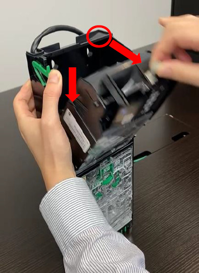③ 緑色のアクセプターラッチを下げながら返却スイッチのつまみを自身の方へ引っ張ると、