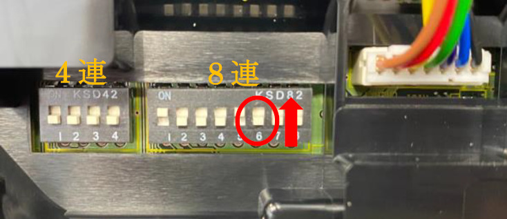 ⑤ディップスイッチ8連側の⑥をONに変更します。(出荷時はOFFになっています)
